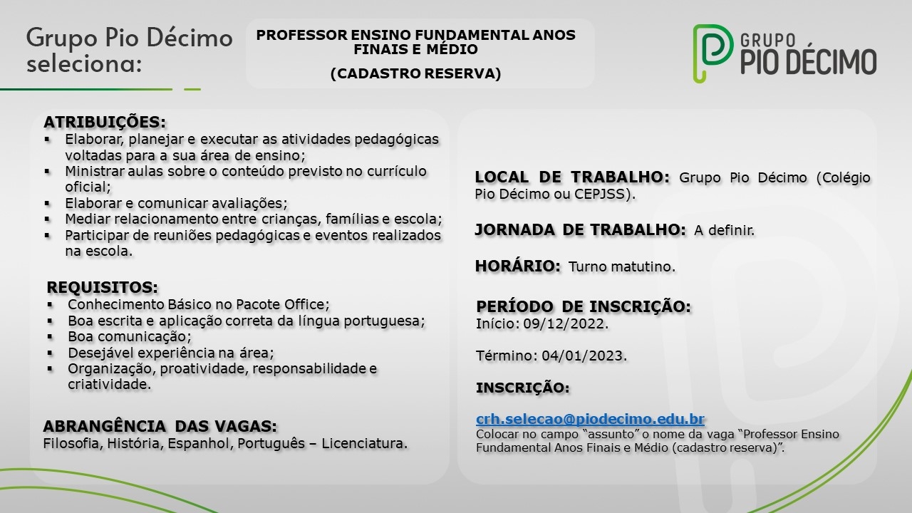 O Grupo Pio Décimo divulga edital de seleção para contratação e/ou formação de cadastro reserva para cargo de professor(a) para Ensino Fundamental Anos Finais e/ou Ensino Médio. O(a) interessado(a) deverá ministrar as seguintes disciplinas: Filosofia, História, Espanhol e/ou Português - Licenciatura.